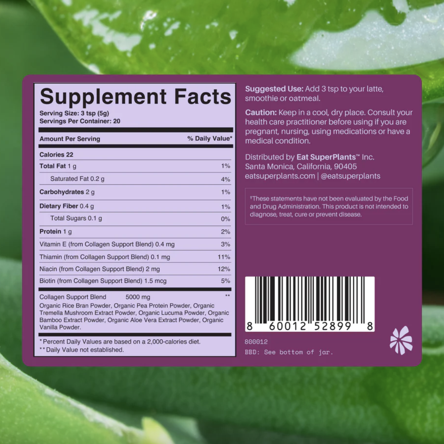 Ólíkt hefðbundnum kollagenblöndum, sem oft eru unnar úr beinum nautgripa eða fiska og innihalda sætuefni, bragðefni og önnur aukaefni, er Collagen Support 100% lífræn og plöntumiðuð vara, án dýraafurða og án óþarfa aukefna.