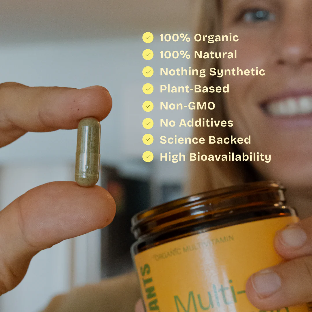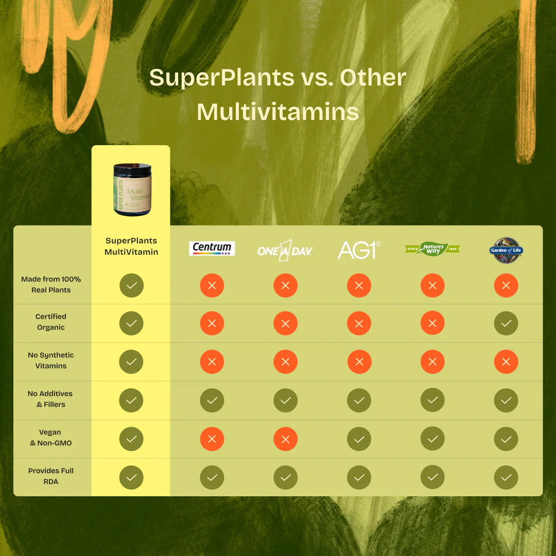 100% lífræna fjölvítamínið frá Super Plants er unnið úr raunverulegum plöntum og heilnæmri fæðu, án tilbúinna vítamína, fylliefna eða annara aukefna.